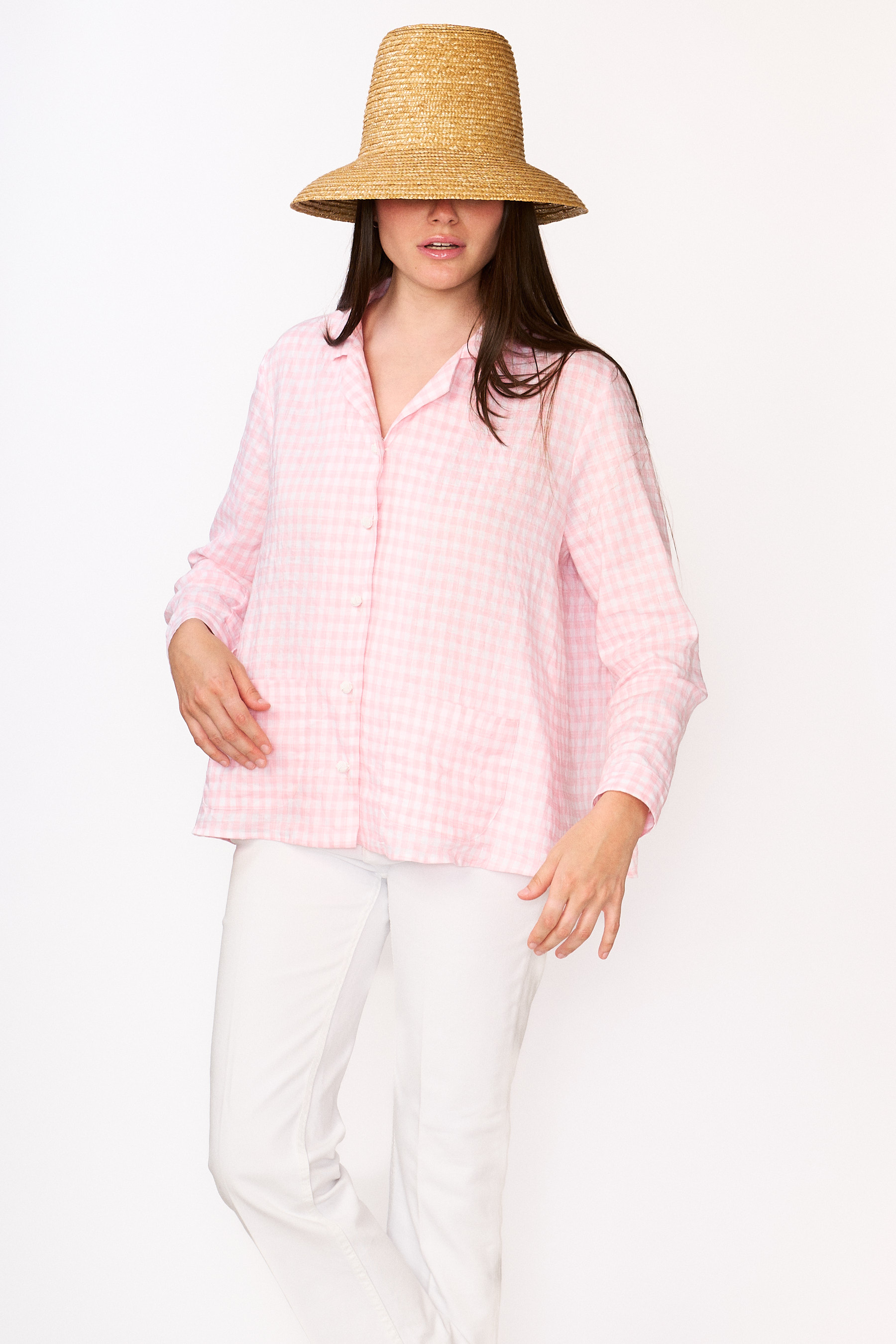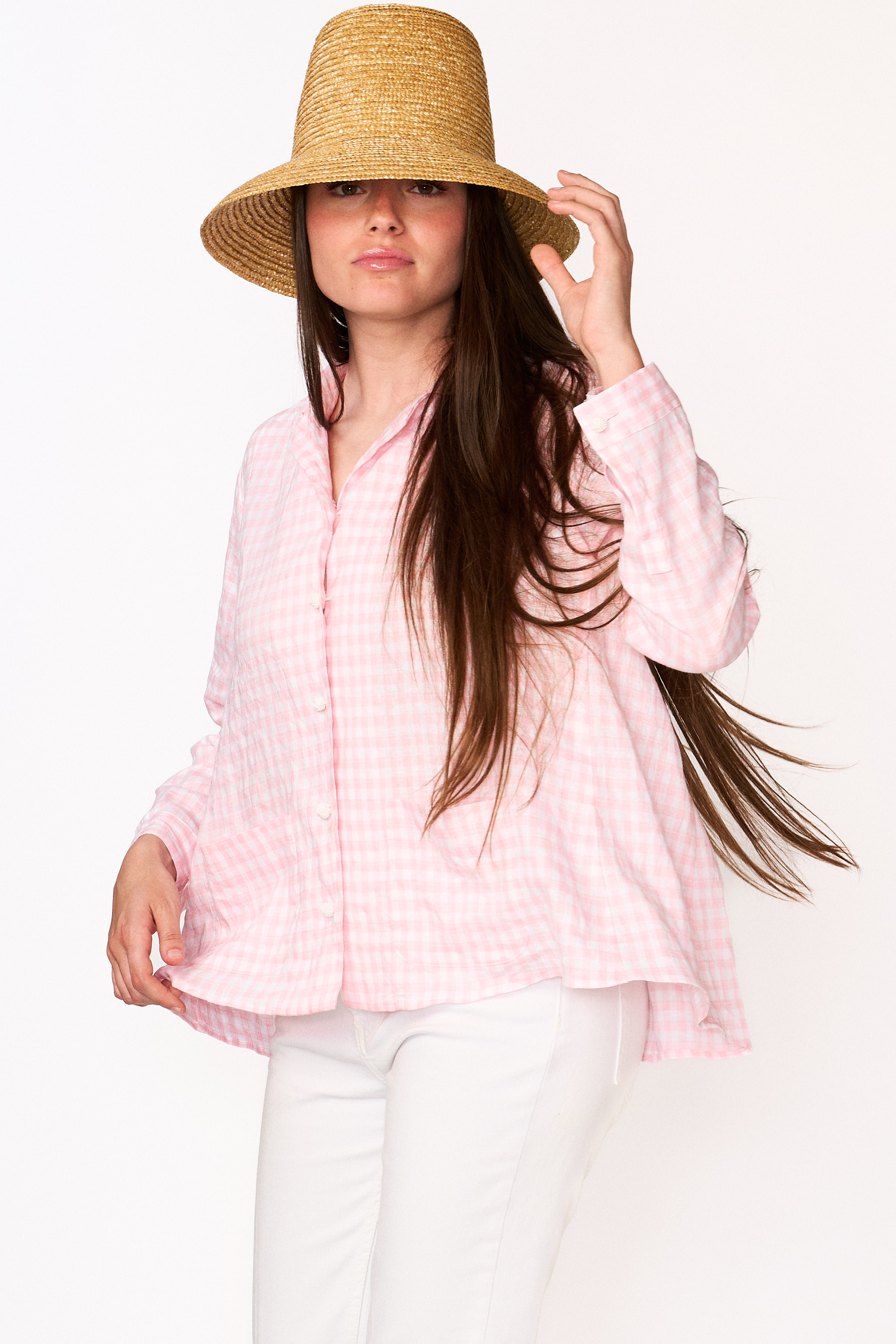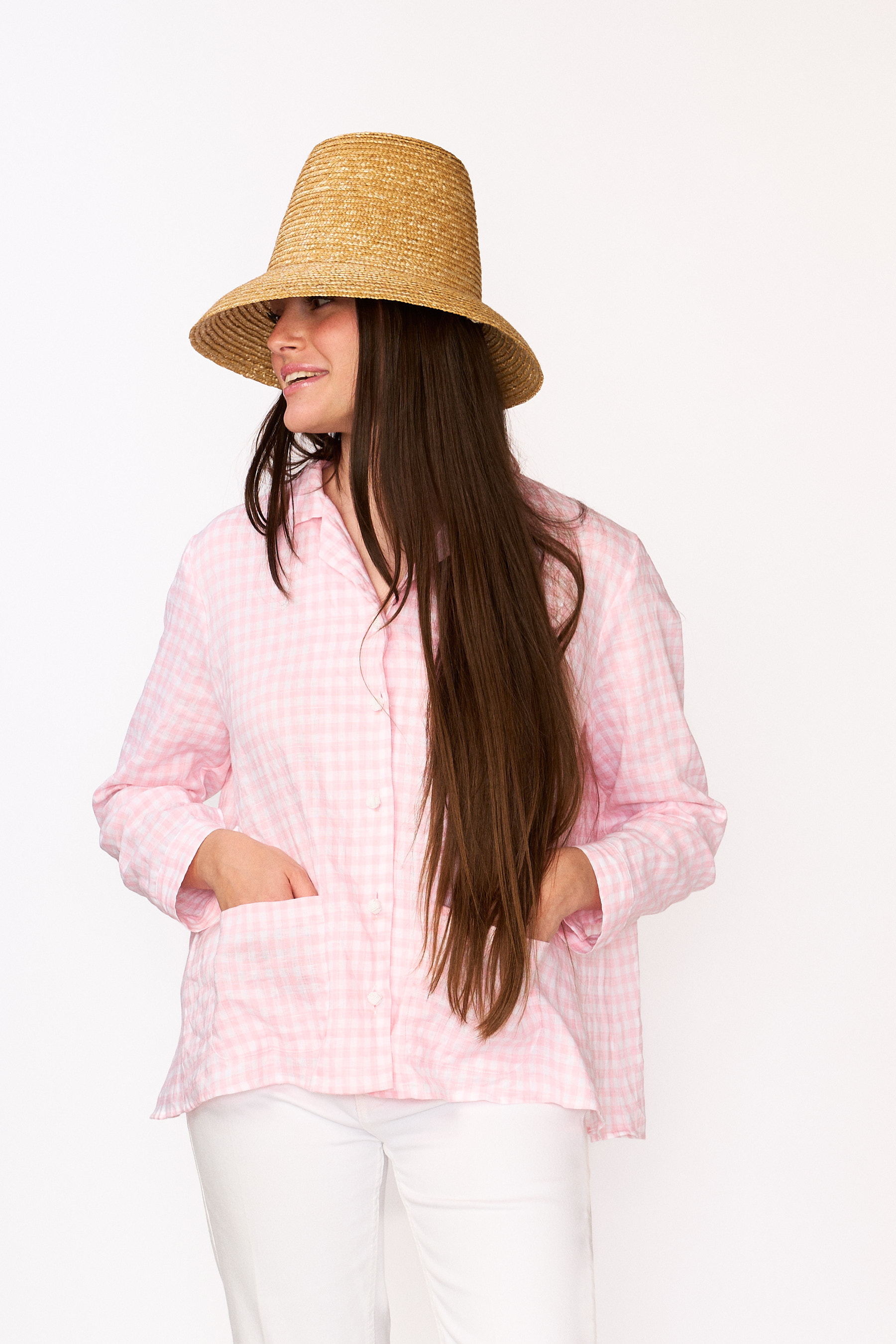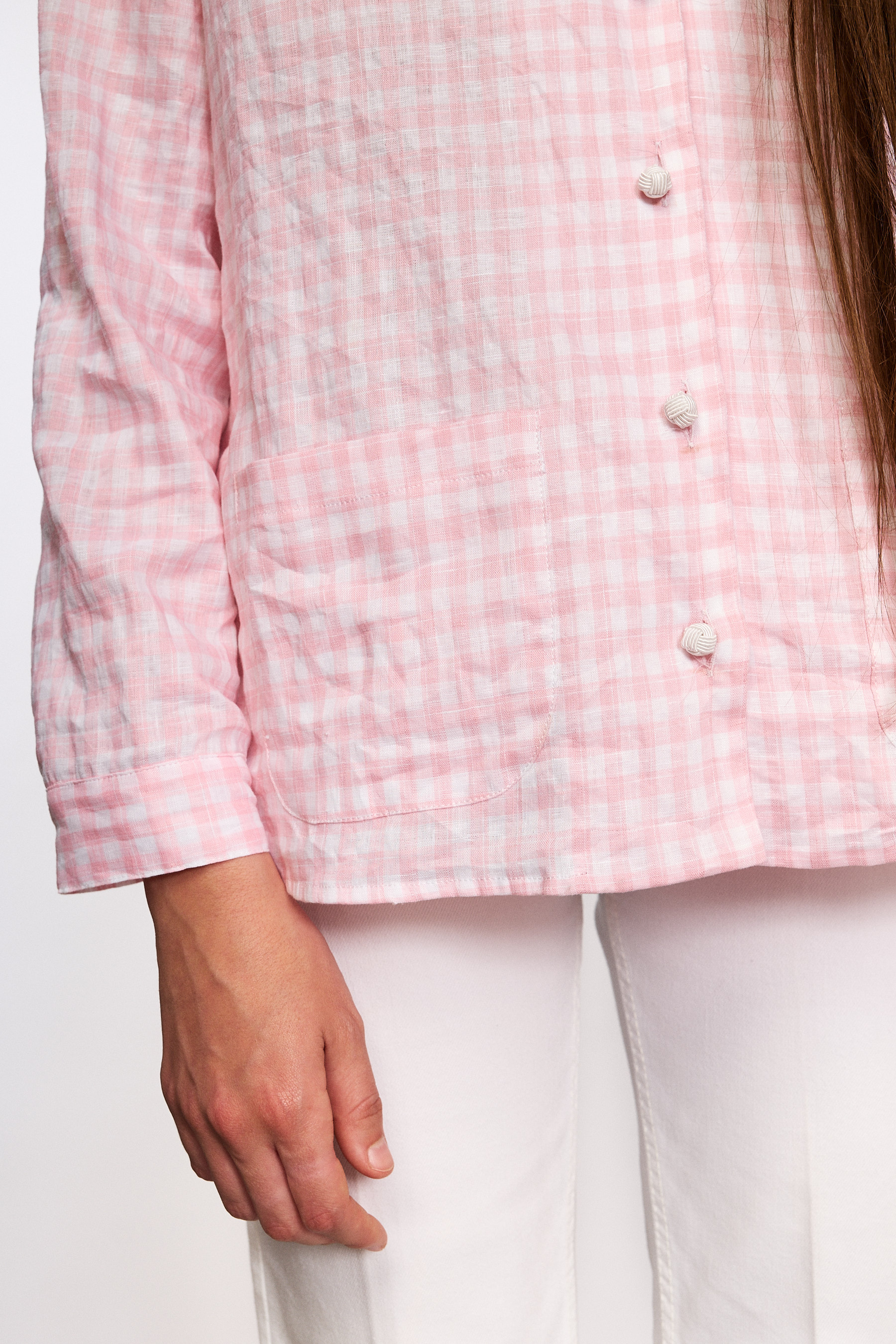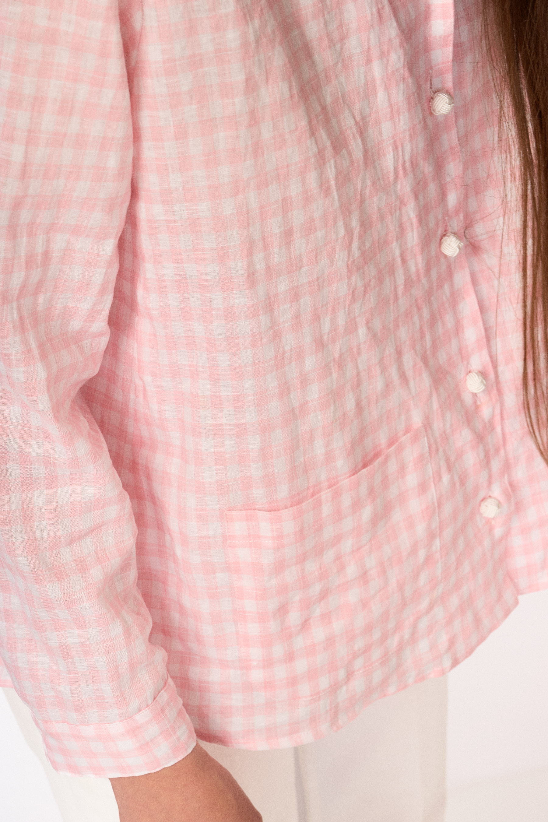 Camicia di lino lavato non stirato di un delicato vichy rosa.