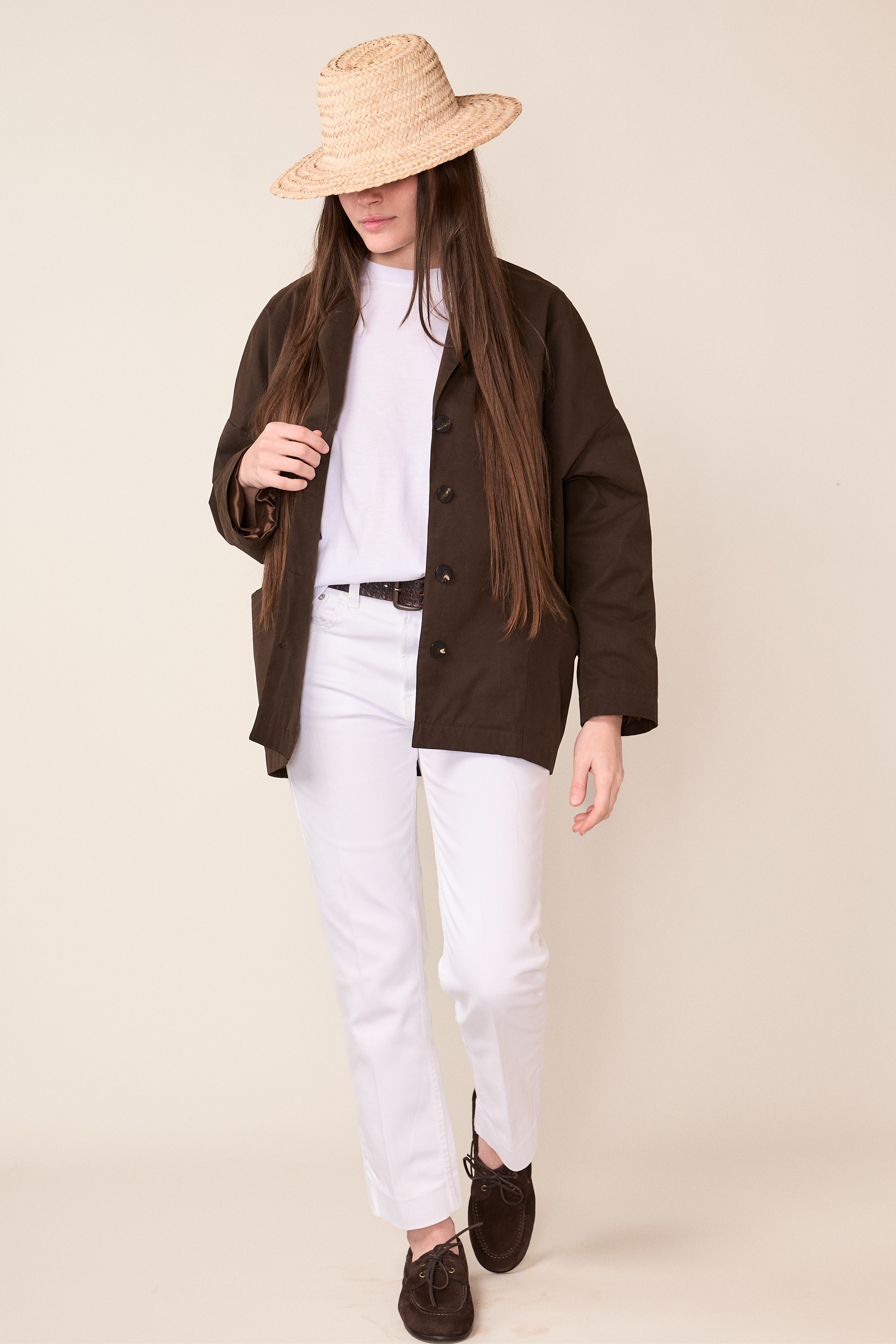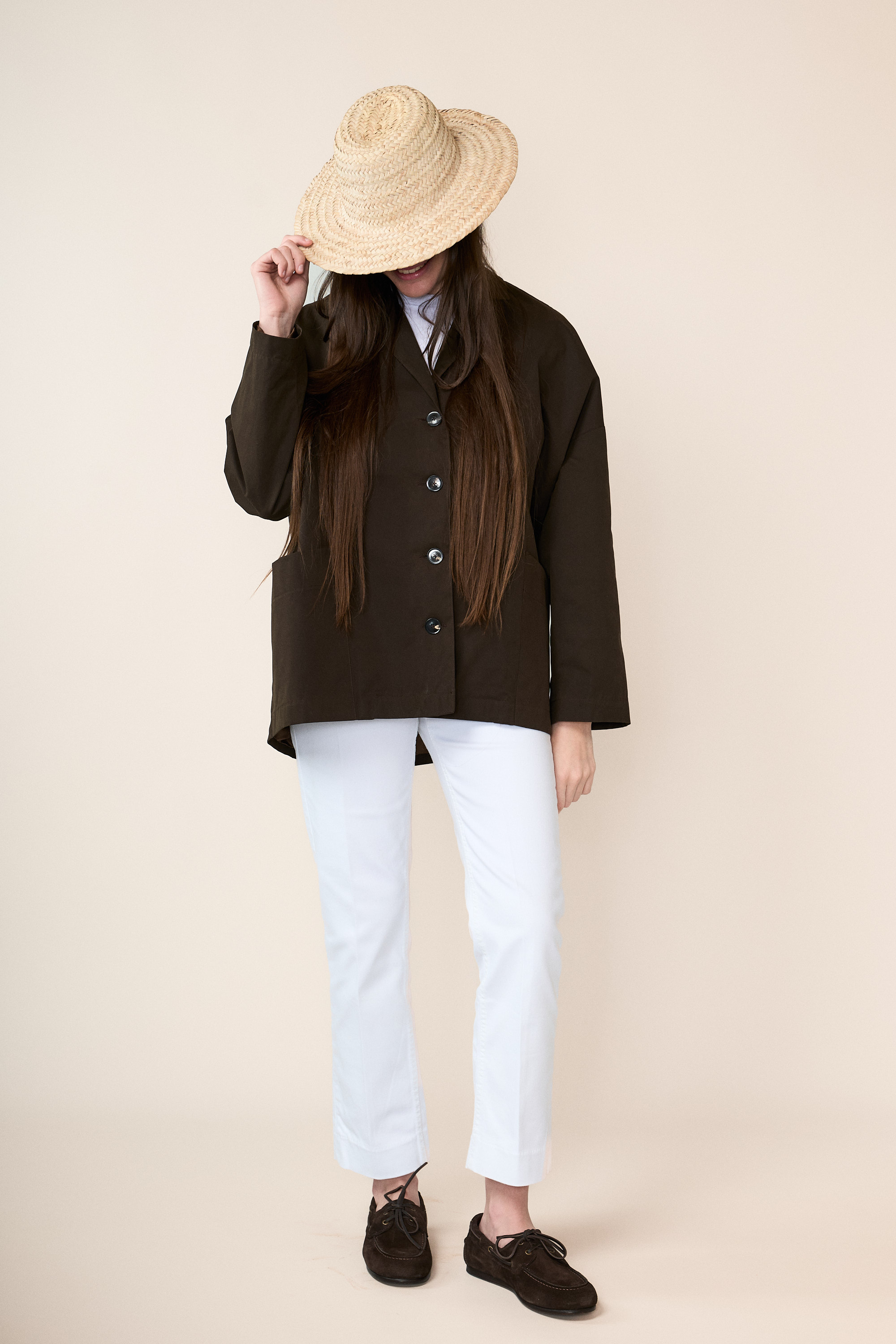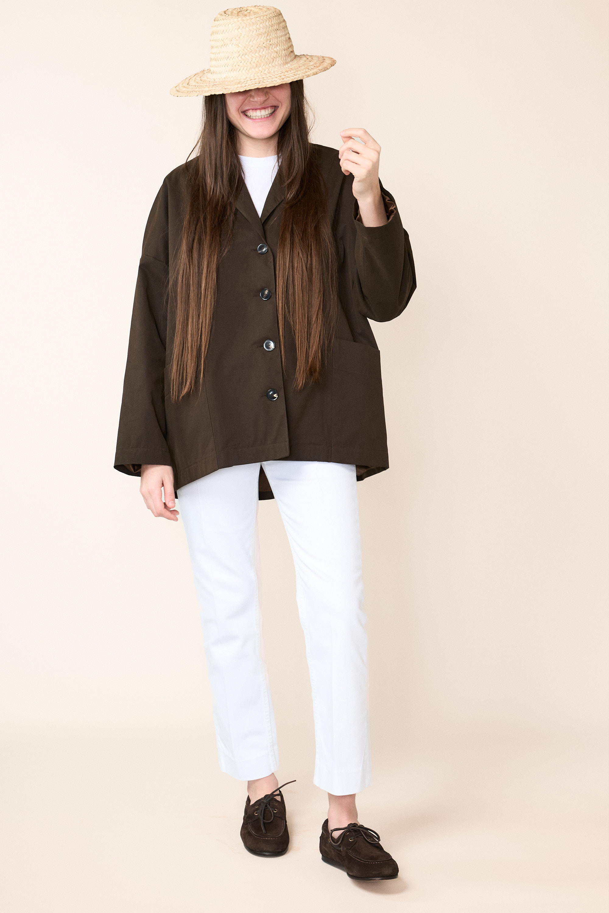 Spalla scesa, allacciatura centrale con bottoni gommati molto piacevoli al tatto e generose tasche laterali.