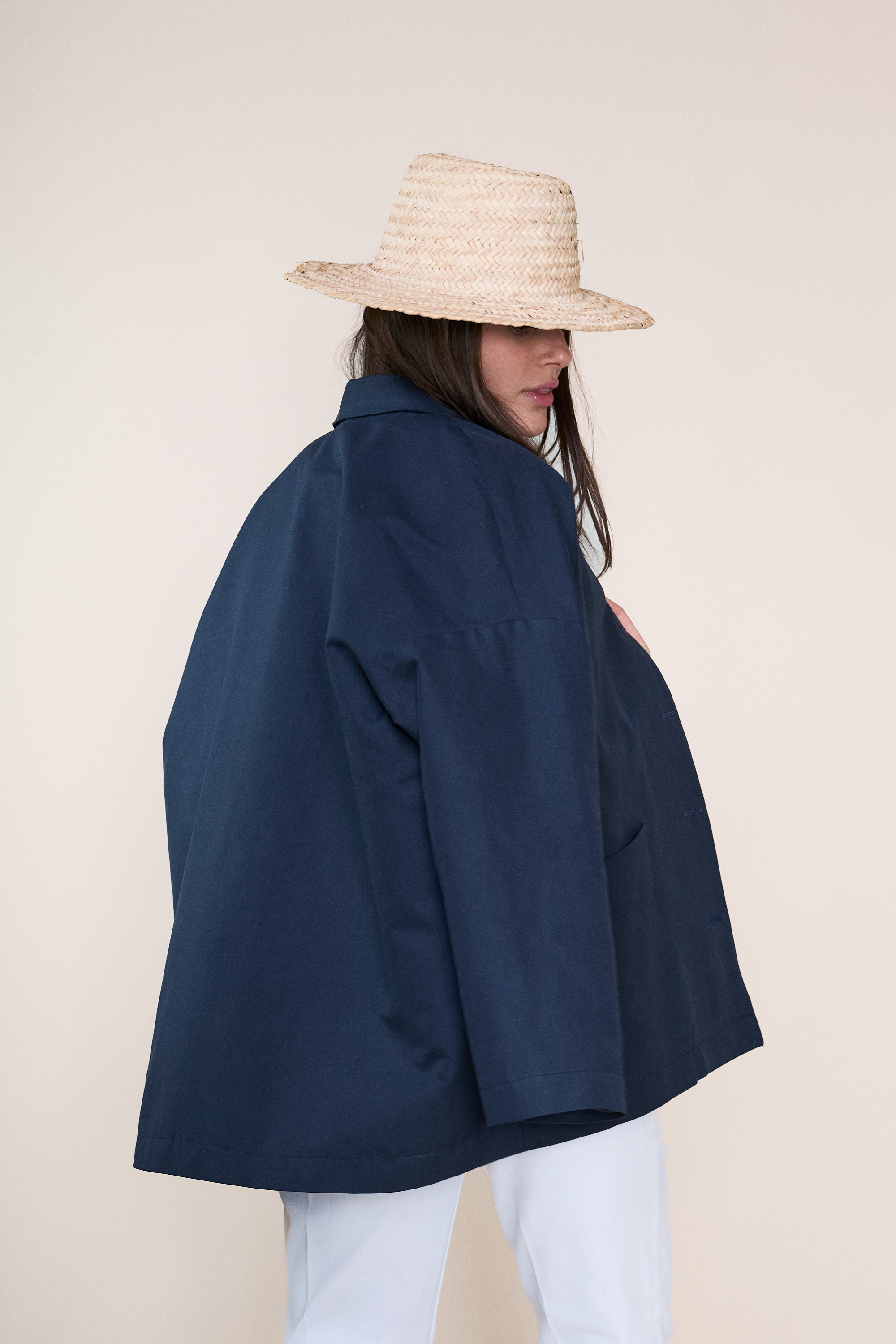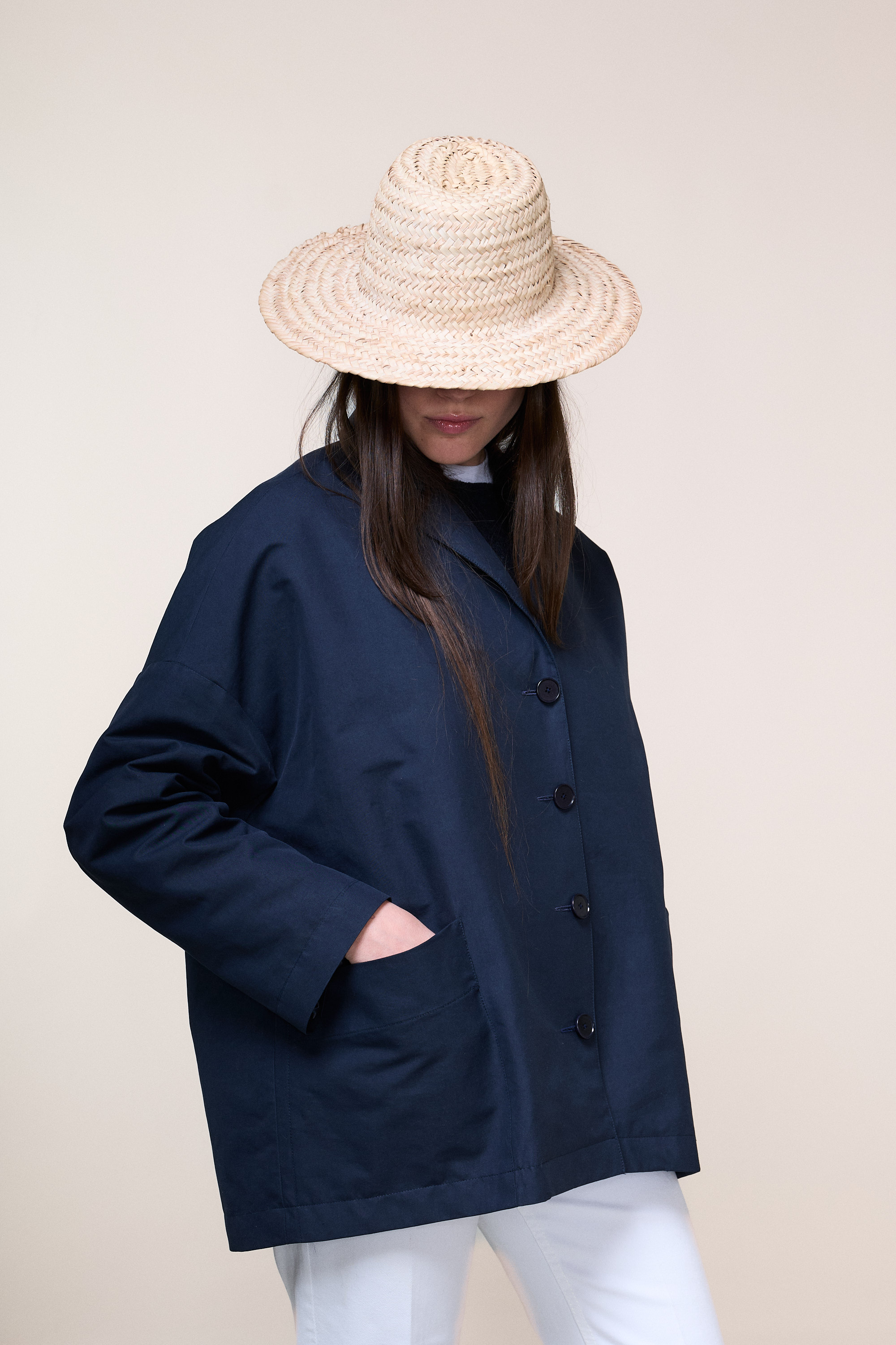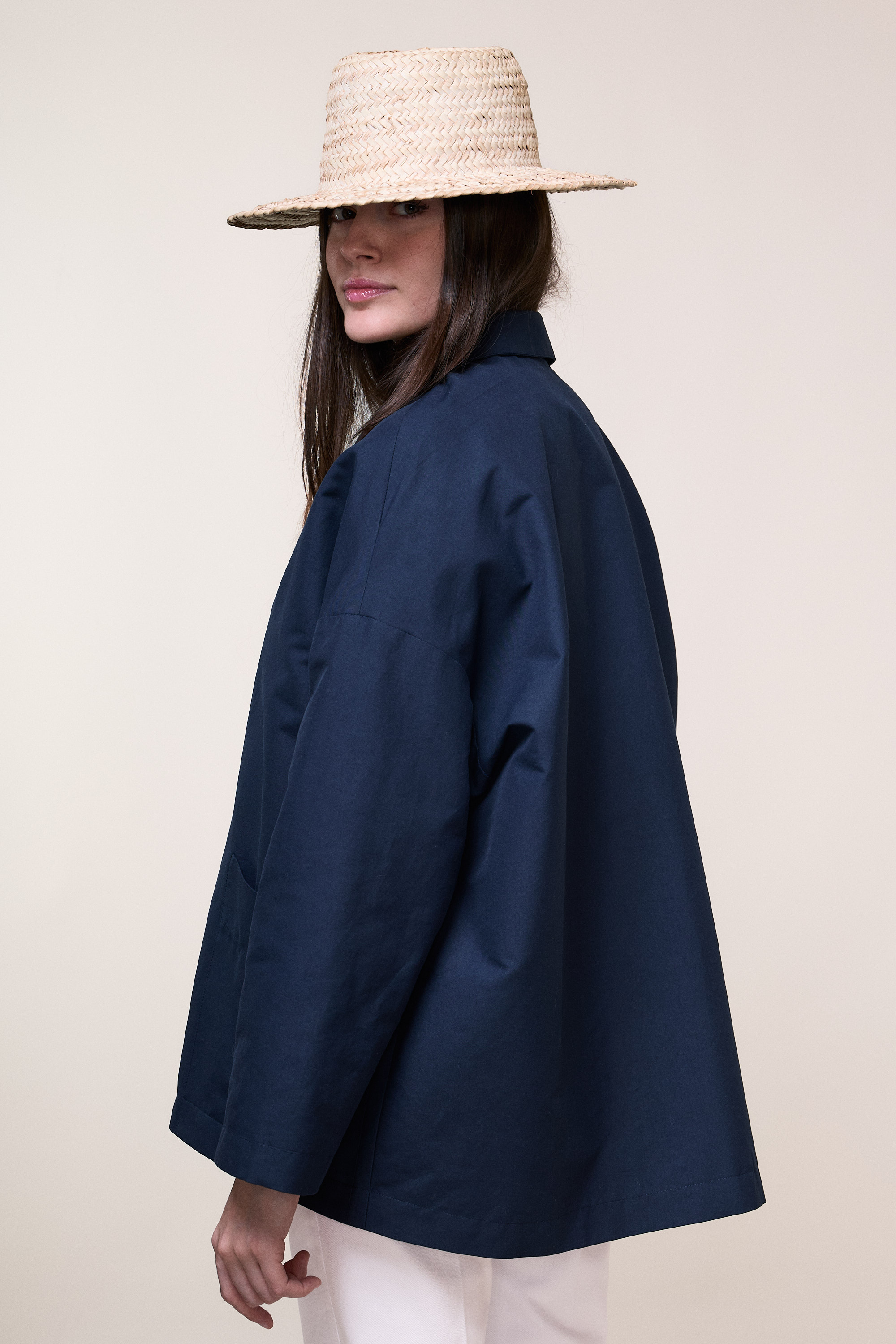 La giacca è confezionata con un pregiato cotone blu mare mano croccante.