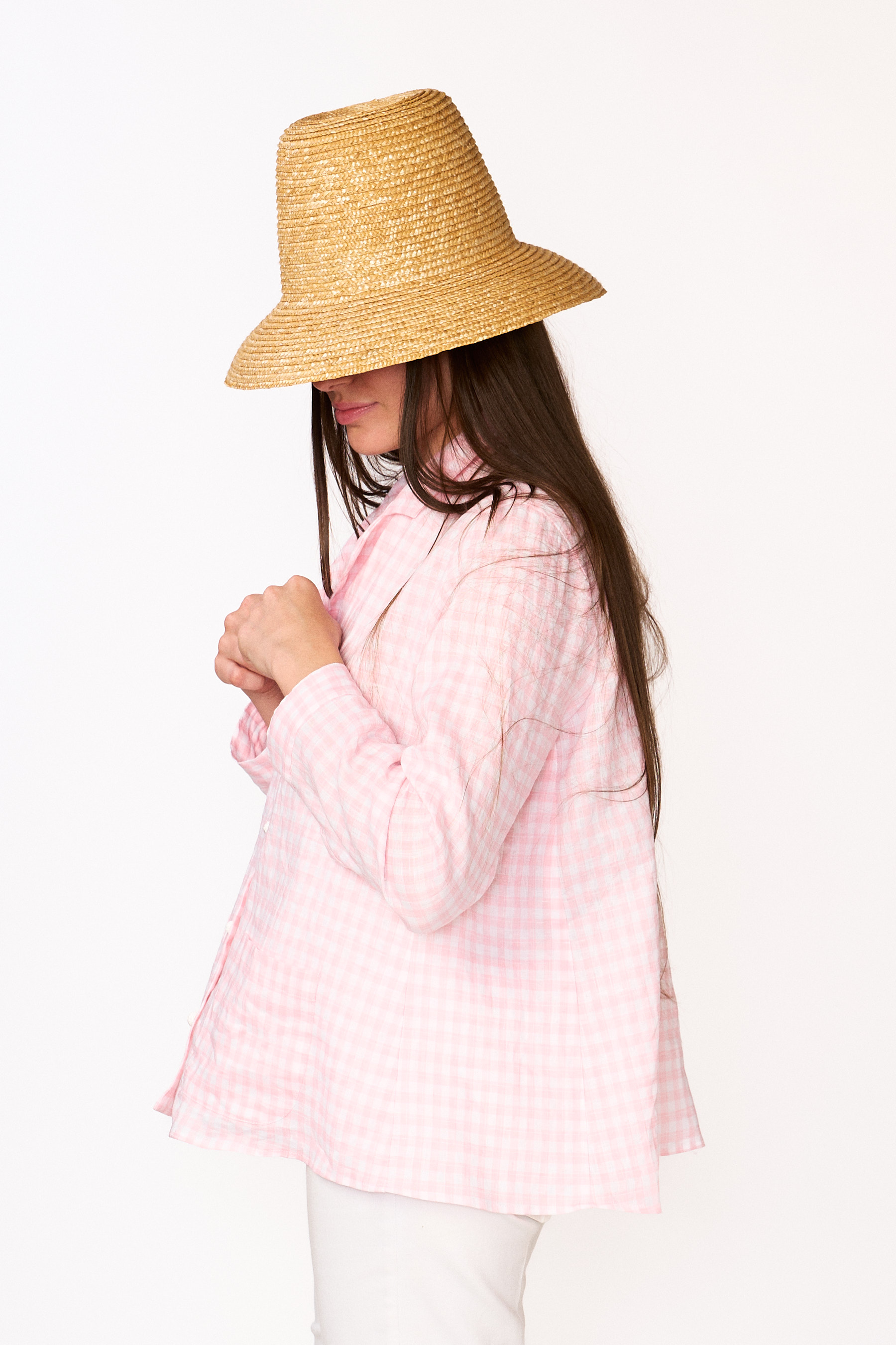 Camicia di lino lavato non stirato di un delicato vichy rosa.