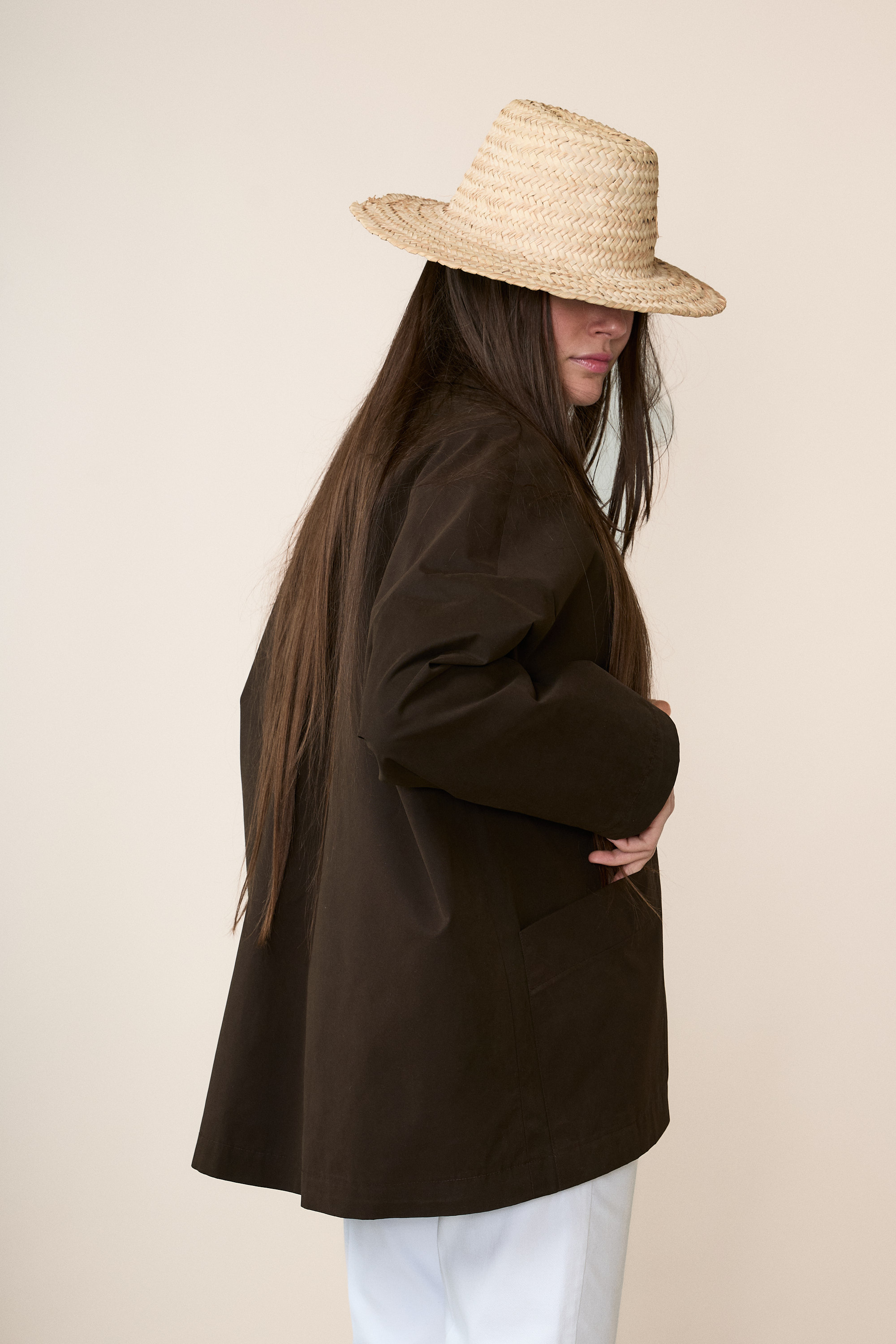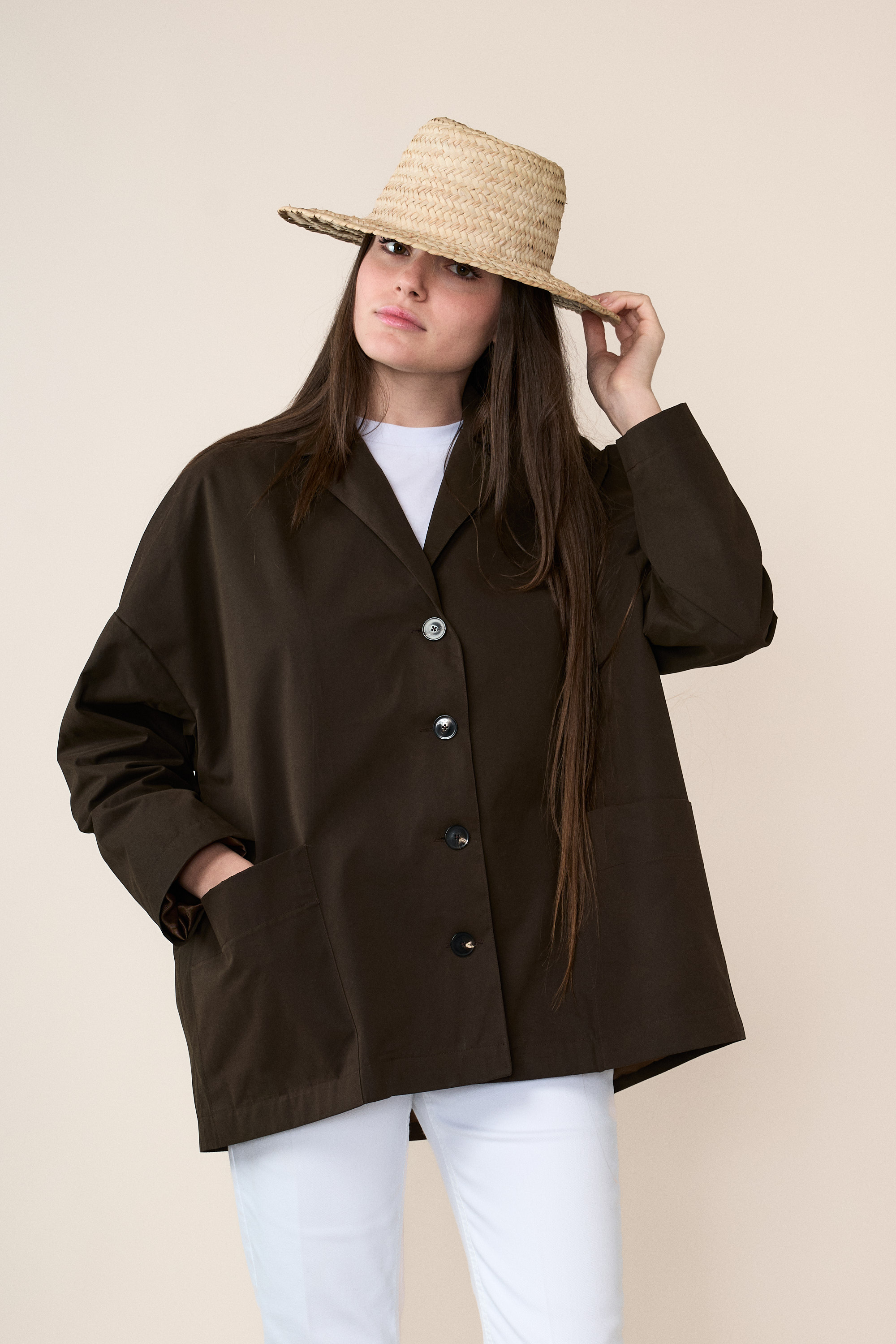 Spalla scesa, allacciatura centrale con bottoni gommati molto piacevoli al tatto e generose tasche laterali.