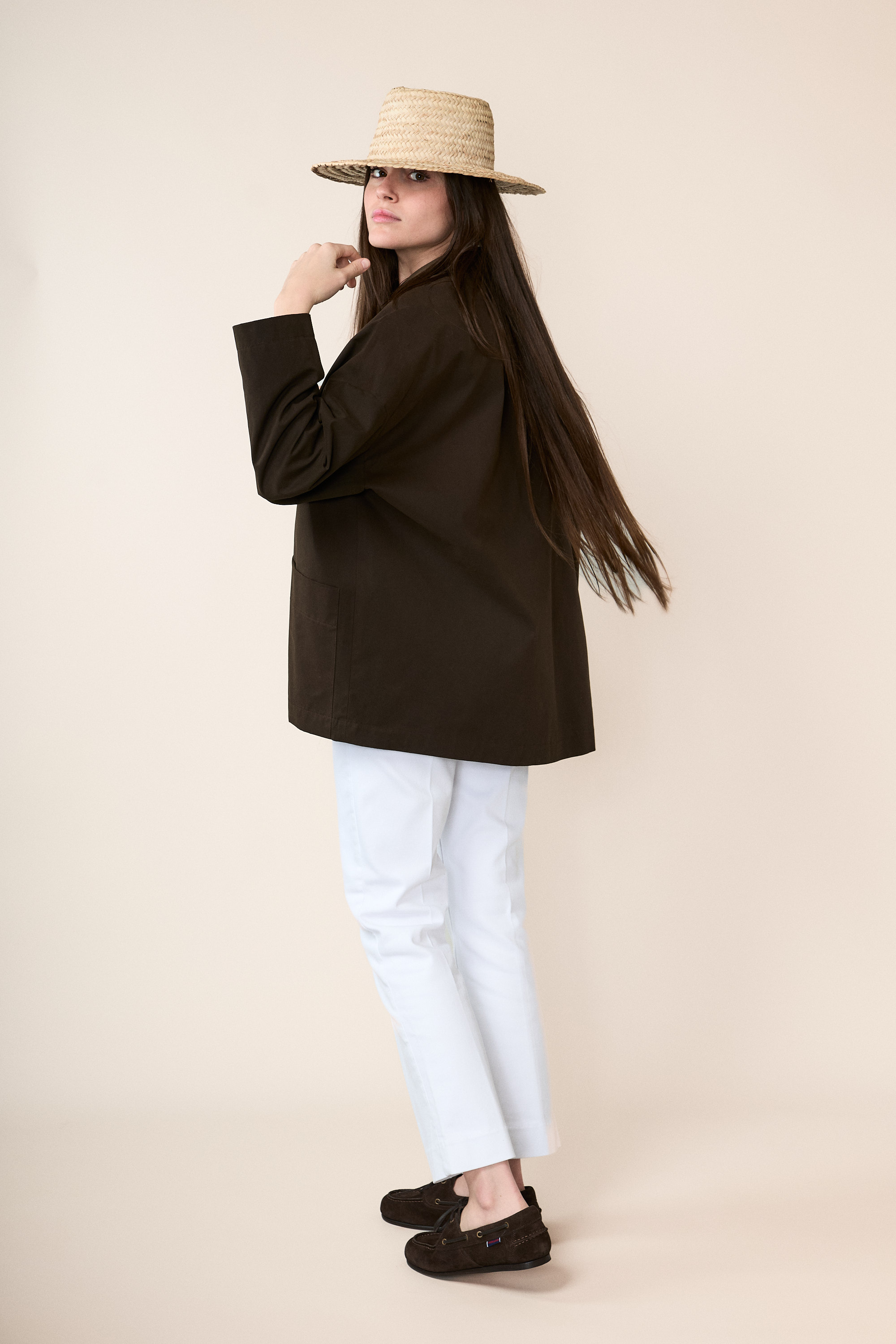 La giacca è confezionata con un cotone mano pesca, sottoposto ad un trattamento che lo rende idrorepellente.