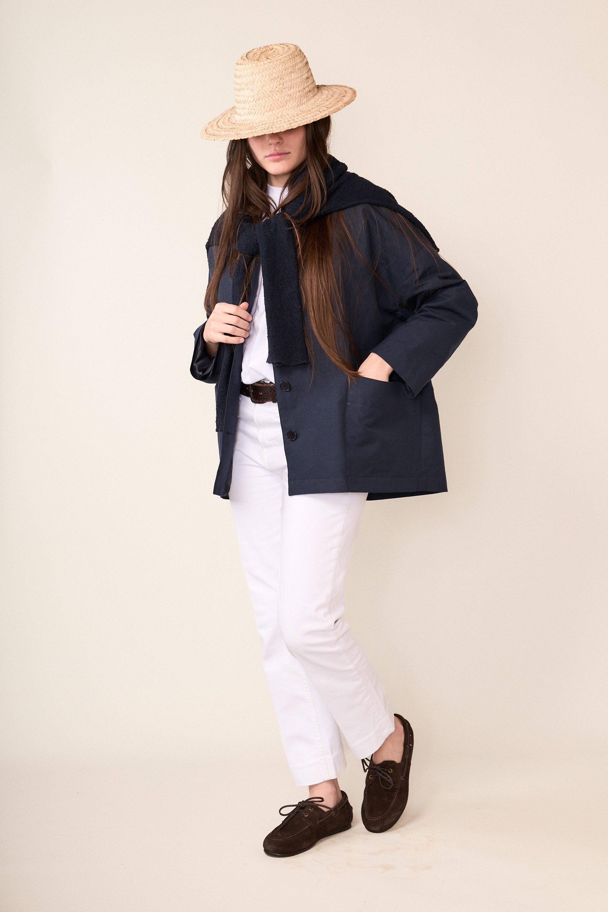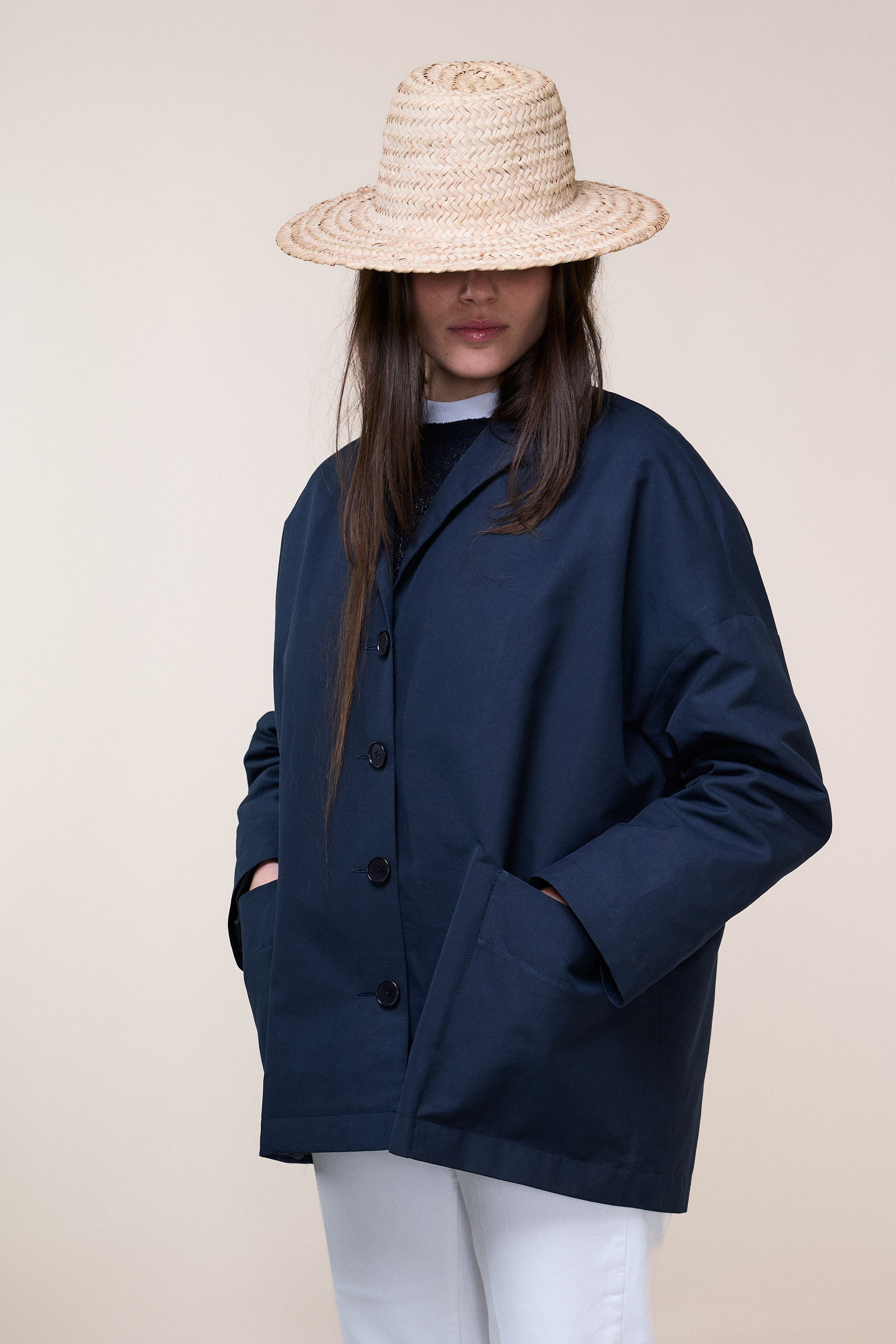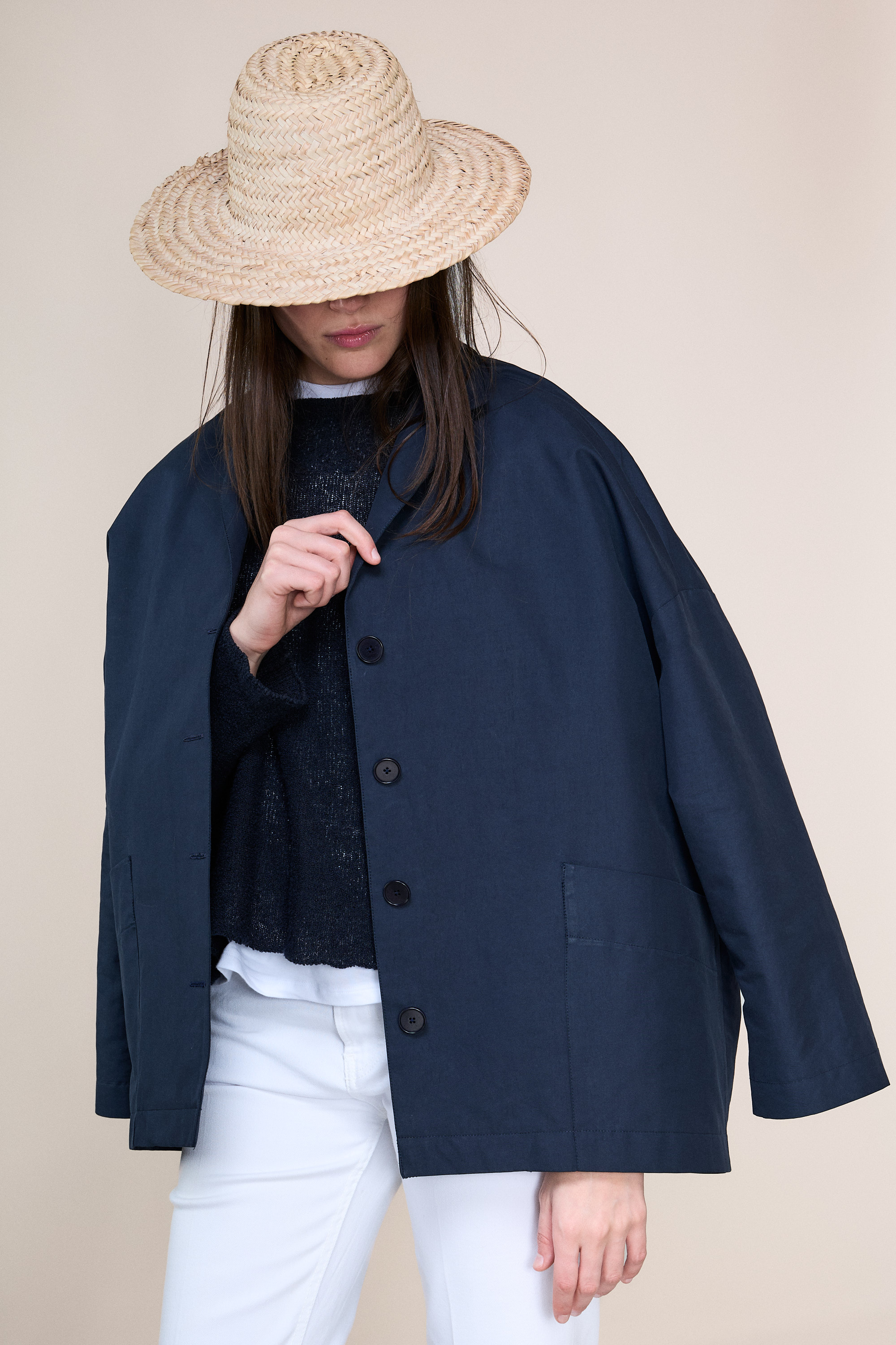 La giacca è confezionata con un pregiato cotone blu mare mano croccante.
